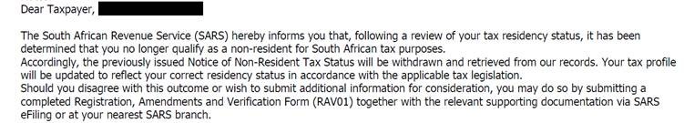 Some individuals who previously formally ceased South African tax residency — and who are in possession of the SARS issued Notice of Non-Resident Tax Status — are receiving fresh correspondence from the tax authority about a review and withdrawal of their non-resident tax status.